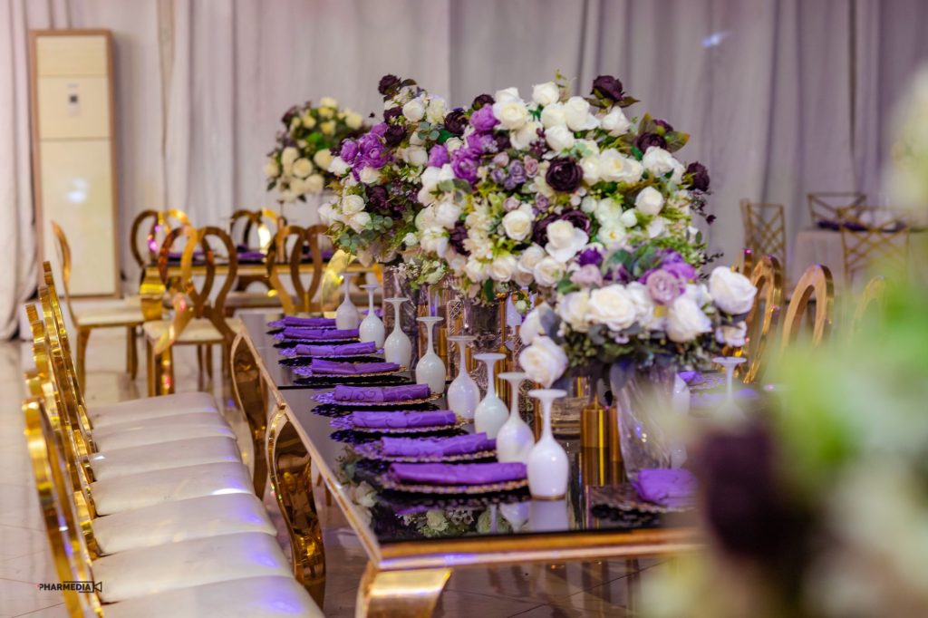 Imagine stepping into a grand hall, where every detail has been meticulously crafted to create a rather warm, inviting glow from chandeliers that hang like sparkling jewels from the ceiling, casting the regal element to the atmosphere. Even the tables and chairs understood the assignment; draped in luxurious golden linens of rich paisely tapestry, creating a regal backdrop for the evening’s festivities. At the center of each table, stunning flower centerpieces command attention, a harmonious blend of flora and decorative elements, intersperesed with candelabras. From the glassware, to the drapes of sheer fabric cascading from the ceiling, creating an ethereal experience, showcasing daring opulence and refinement, which added elegance to the environment.